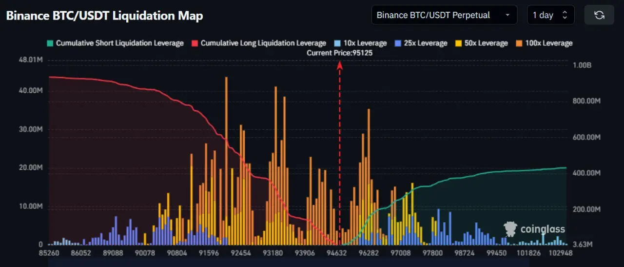 Another chart from Coinglass, showing the BTC/USDT perpetual liquidation map on Binance, indicates that the cumulative short liquidation leverage on the exchange at $96,282 stands at 157.04 million, with the majority being 100X leverage, accounting for 19.50 million. 50x leverage follows with 14.70 million, the whole 25x leverage trails last with 1.14 million