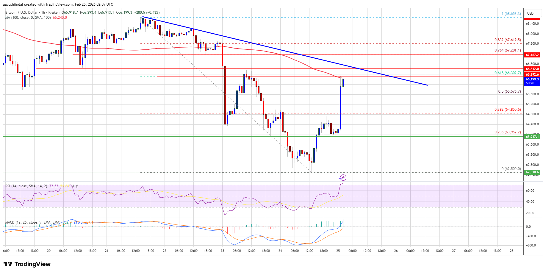 Bitcoin is now trading below $66,500 and the 100 hourly simple moving average. If the price remains stable above $65,000, it could attempt a fresh increase. Immediate resistance is near the $66,500 level. There is also a bearish trend line forming with resistance at $66,600 on the hourly chart of the $BTC/USD pair.