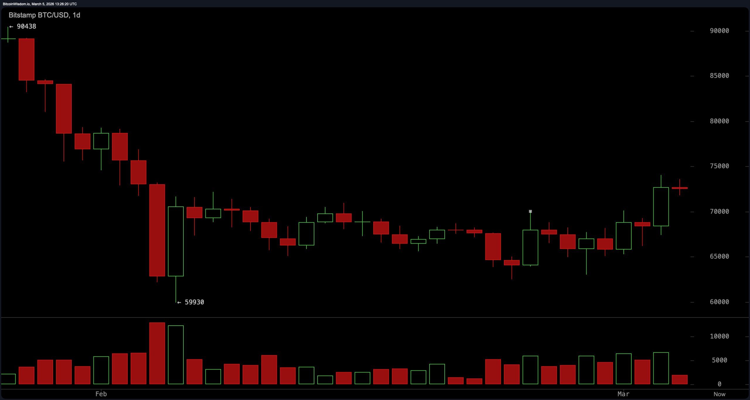 Bitcoin traded at $72,648 on March 5, 2026, consolidating between $72,600 support and $73,100 resistance after an overnight push higher lost momentum. Technical indicators across the 1-hour, 4-hour, and daily charts show a market hovering in neutral territory as momentum indicators flatten and key moving averages point in competing directions.