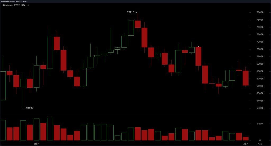 Each recovery attempt has produced a lower high. The range between $65,900 and $69,000 is tightening. Volume is heavier on down moves than on recoveries, which tells you sellers are still in control even when the price action looks quiet.