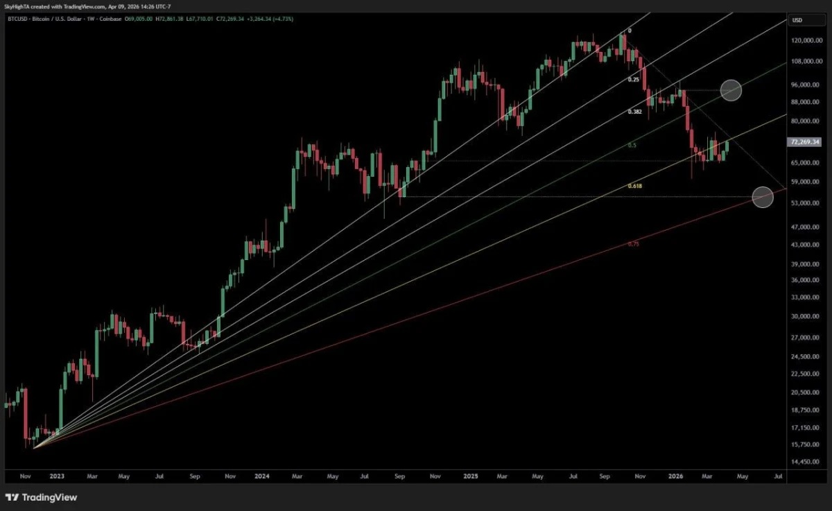 The chart shows Bitcoin on the weekly timeframe trading near $72,269 after bouncing from the lower part of the current Fibonacci fan structure. Price recently recovered from the mid $60,000 area and is now pushing back toward the next projected path higher. That rebound matters because the move started near the 0.5 fan zone, which the chart treats as an important support area.