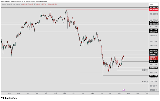 Bears are gradually stepping in and building a stronger case for a pullback. A decisive break below the $73,700 level could accelerate the move toward the lower boundary of the rising wedge. If that structure breaks to the downside, Bitcoin could extend its decline toward the monthly open region around $65,000 over the coming weeks.
