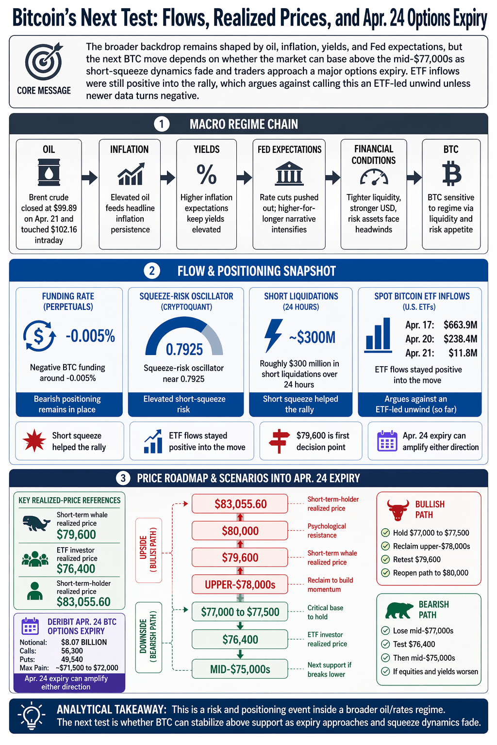 The latest price action suggests the first pressure point is the risk channel, with the oil and rates channel operating in the background. The question now is whether $BTC can turn the mid-$77,000s into a base before the Apr. 24 options expiry and the next macro calendar cluster.