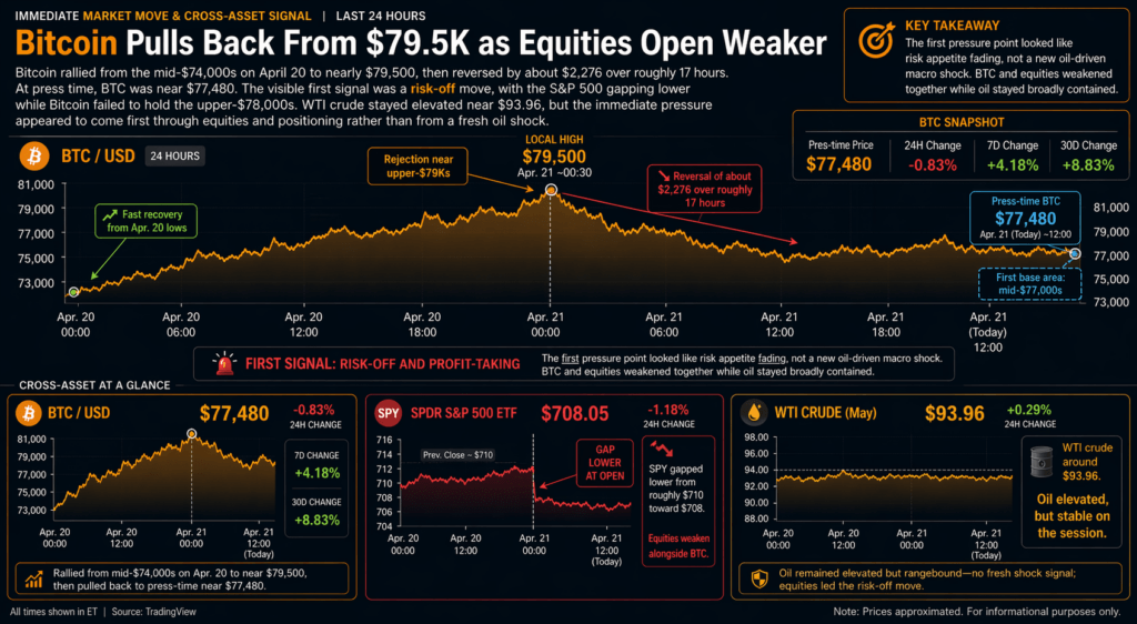The current Bitcoin price chart shows $BTC rallying from roughly the mid-$74,000s on Monday, Apr. 20, to a local high near $79,500 yesterday, then reversing by about $2,276 over roughly 17 hours.