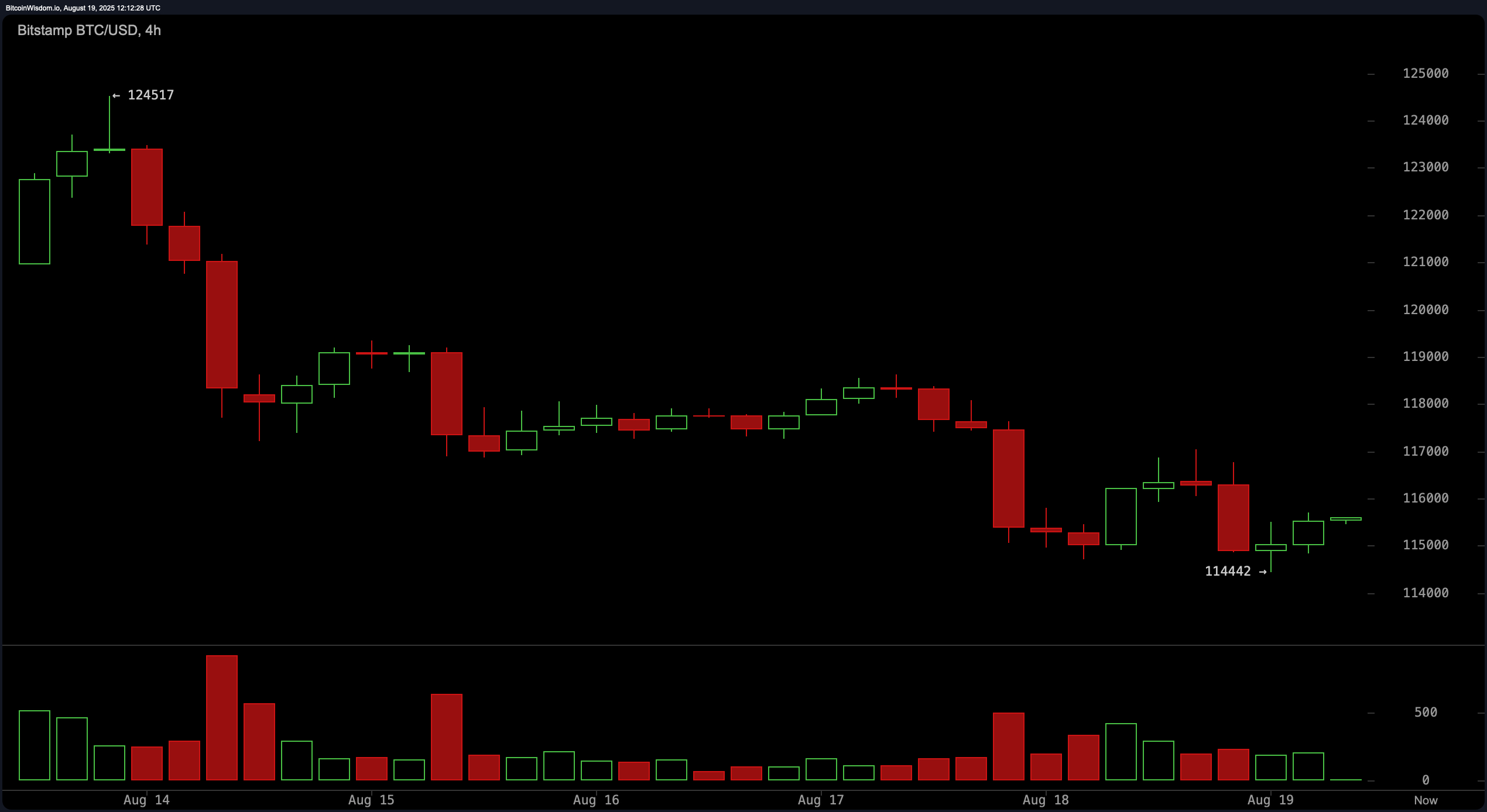 Short-term price action on the 1-hour bitcoin chart is characterized by a gradual climb from the $114,442 base, forming higher lows. However, the weakening volume on green candles signals diminished buy-side pressure. For intraday traders, a break above $116,000 could prompt a short-term bounce toward $117,000–$117,500, potentially driven by a short squeeze. Conversely, a drop below $114,500 would likely accelerate downside momentum and negate the current recovery structure.