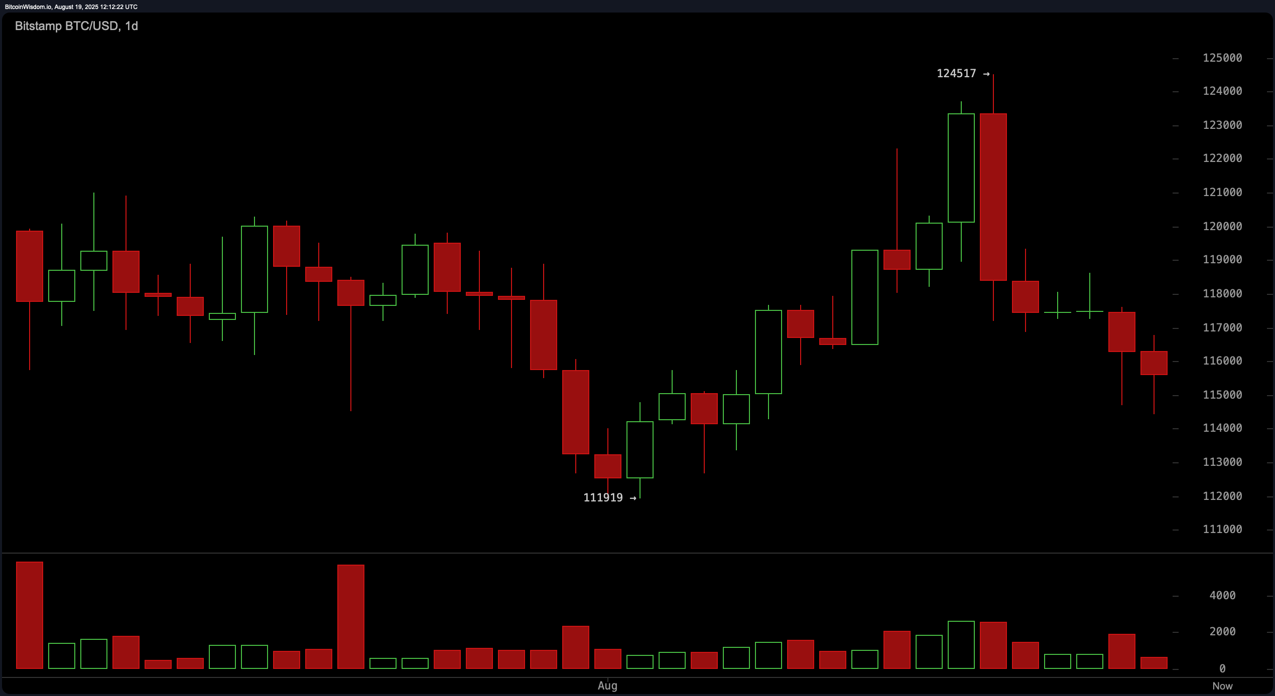 Bitcoin’s price stands at $115,497 as of Aug. 19, 2025, positioning the asset within a $2.3 trillion market capitalization and a 24-hour trading volume of $37.47 billion. Over the past 24 hours, bitcoin traded within a narrow intraday range of $114,733 to $116,996, pointing to a consolidative phase after recent volatility.