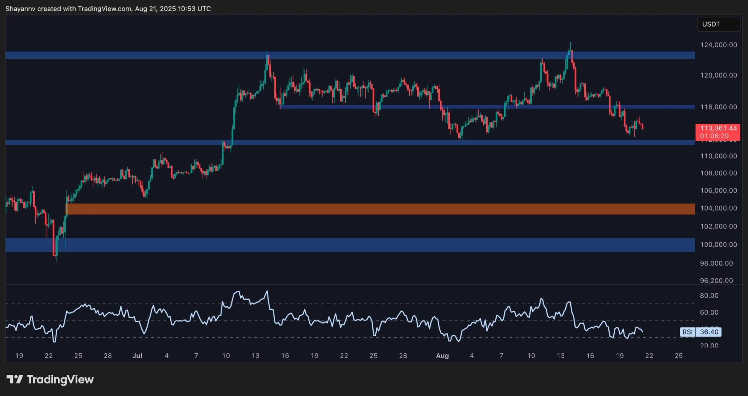 At the same time, the RSI remains under the 50 mark, signalling clear bearish momentum, and is now approaching oversold conditions, which could materialize if the $112K zone fails to hold.
