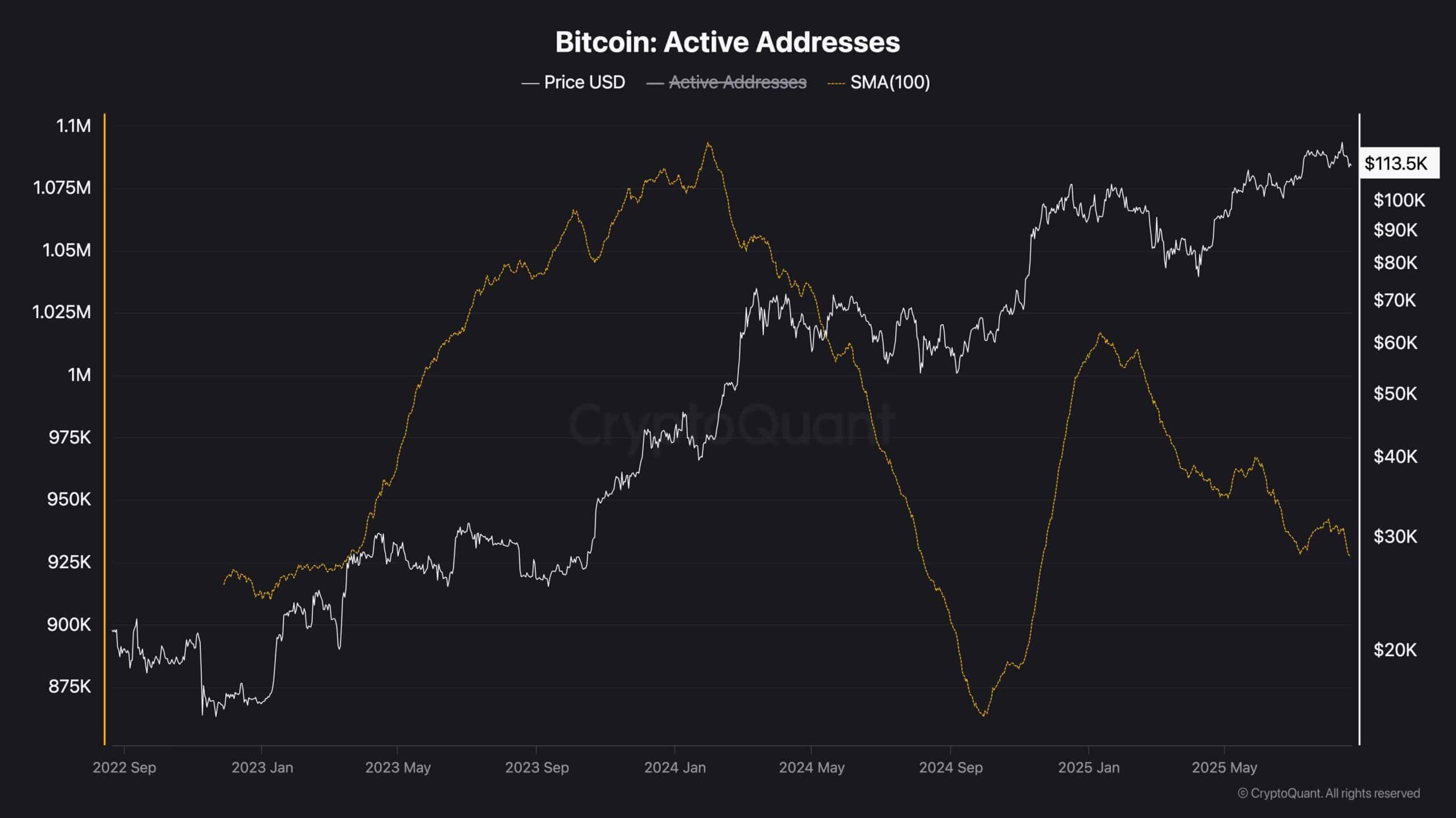 The chart above shows the 100-day moving average of Bitcoin’s active addresses. While BTC’s price has managed to reach new all-time highs above $113K, the number of active addresses has not followed the same path.