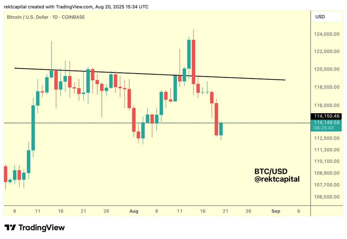 Analyst Rekt Capital described $114K as the deciding short-term level, saying: