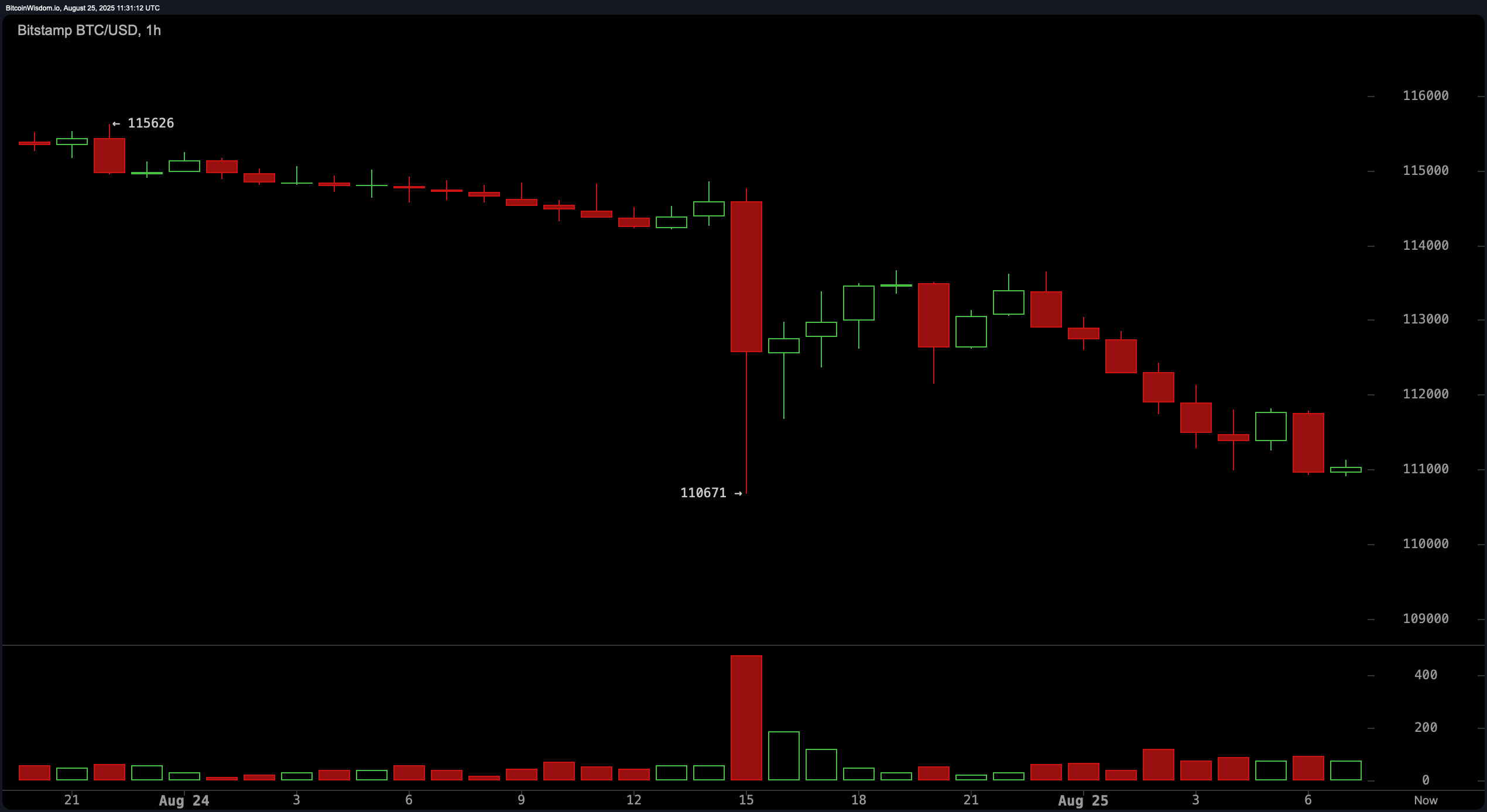 On the 1-hour chart, a significant sell-off candle plunged bitcoin toward the $110,671 zone, followed by a cluster of indecision candles indicating hesitation among market participants. Weak rebound efforts, capped below $113,000, suggest that sellers maintain control. The volume profile aligns with a classic dead cat bounce scenario—high volume during the drop, low volume on recovery—pointing to potential distribution phases rather than accumulation.