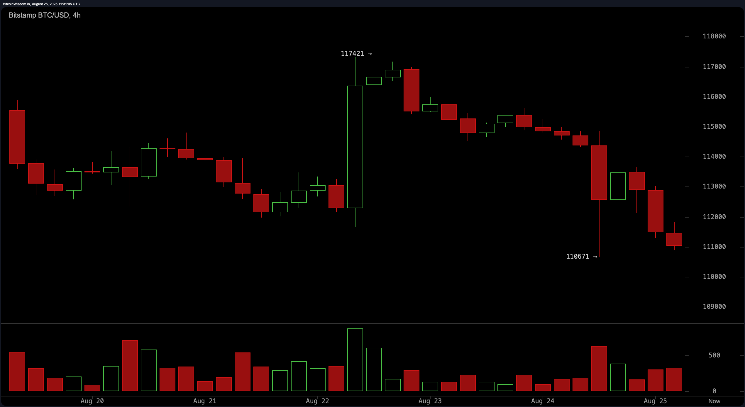 The 4-hour chart reinforces the daily trend, showing a sharp rejection at $117,421 followed by a sustained downward move. This timeframe reflects a failed attempt to reclaim key resistance zones, with the price structure suggesting that any bullish effort is met with immediate sell pressure. Twice revisiting the $110,671 level hints at a potential double bottom, though the muted volume on the subsequent bounce casts doubt on the strength of support. The broader structure continues to favor the bears.