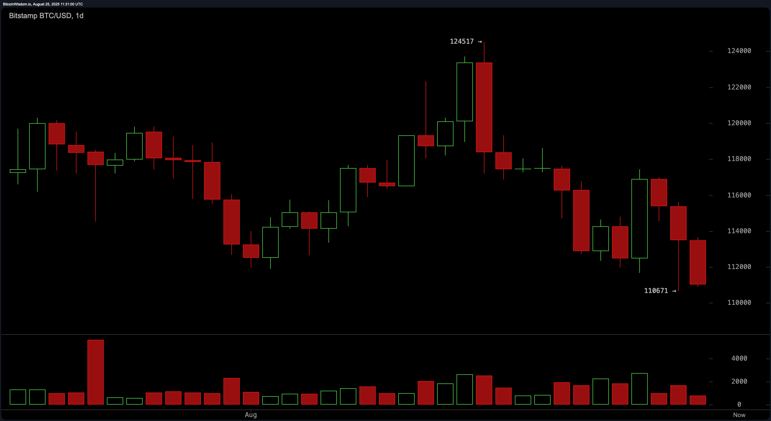 Despite bitcoin’s market capitalization of $2.21 trillion and strong 24-hour trading volume of $48.89 billion, the technical indicators as of Aug. 25, 2025, point to persistent bearish momentum. The intraday price range, fluctuating between $110,956 and $114,802, points to the volatile yet controlled decline that has defined recent market behavior.