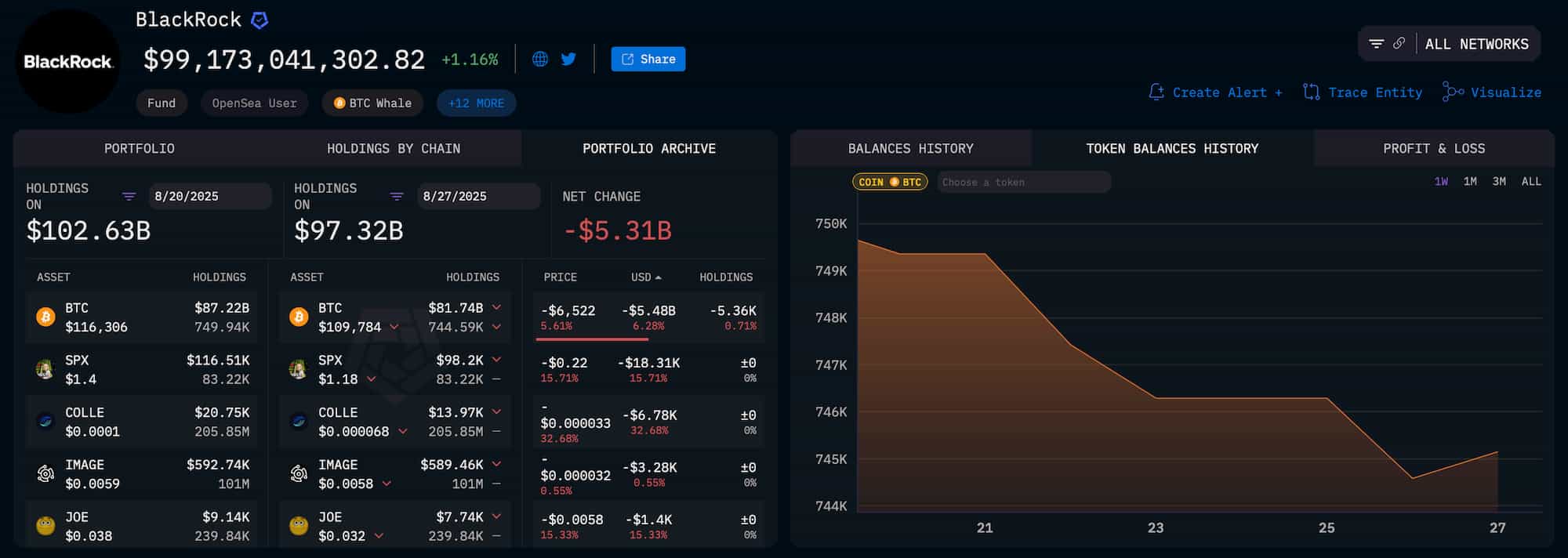 As of August 20, 2025, BlackRock held 749,940 BTC worth $87.22 billion. By August 27, those holdings had dropped to 744,590 BTC valued at $81.74 billion. The decline reveals both a 5,360 BTC reduction in balances and a 6.28% drop in price, with Bitcoin sliding $6,522 over the same period.