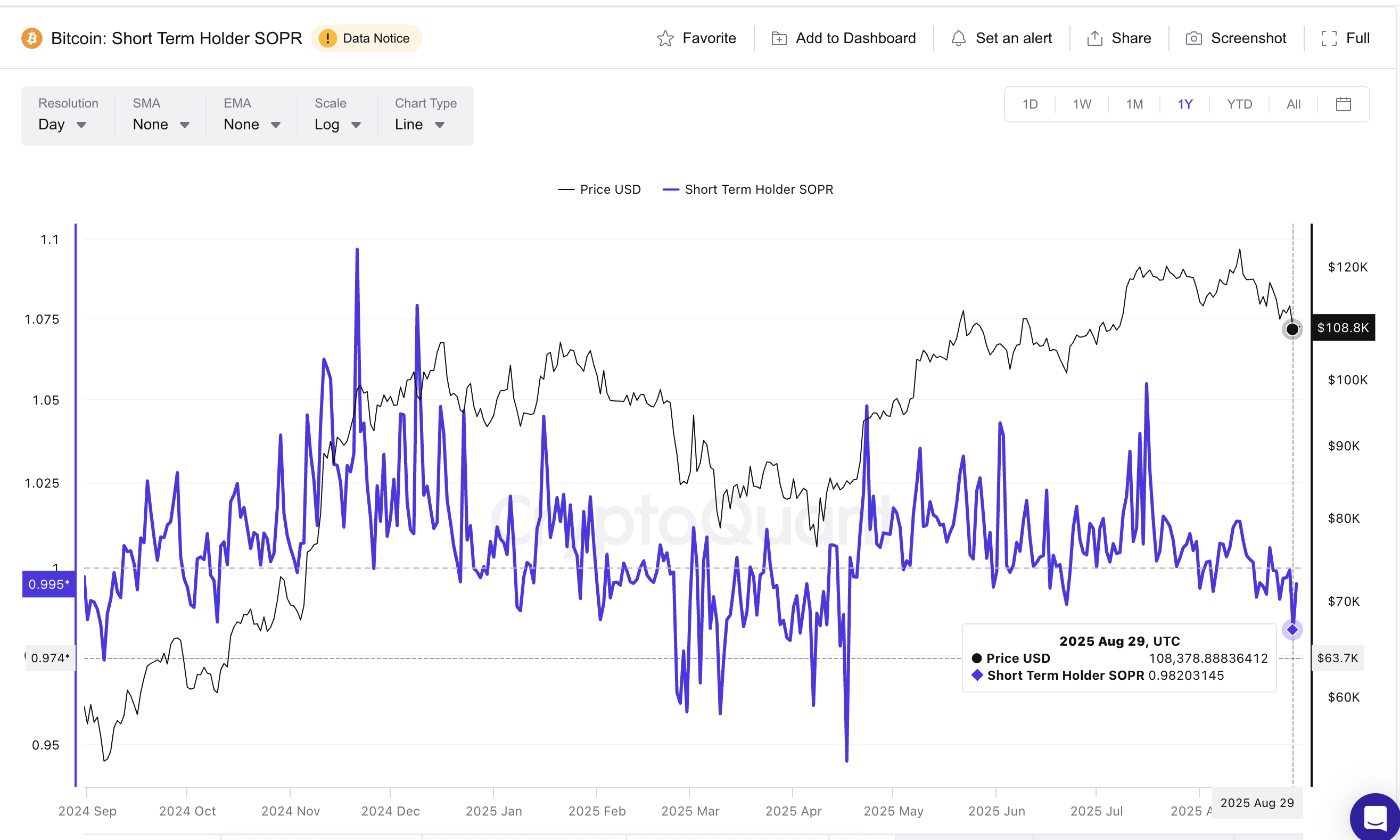 The Spent Output Profit Ratio (SOPR) measures whether coins moved on-chain were sold at a profit or loss. For short-term holders—who are usually the most reactive—the metric provides a near-real-time gauge of sentiment.