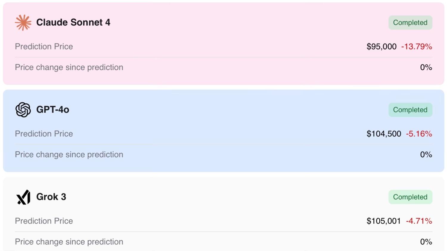 Claude 4 Sonnet offered the most negative projection, predicted a BTC price of just $95,000, which translates to a downside of no less than -13.79%.
