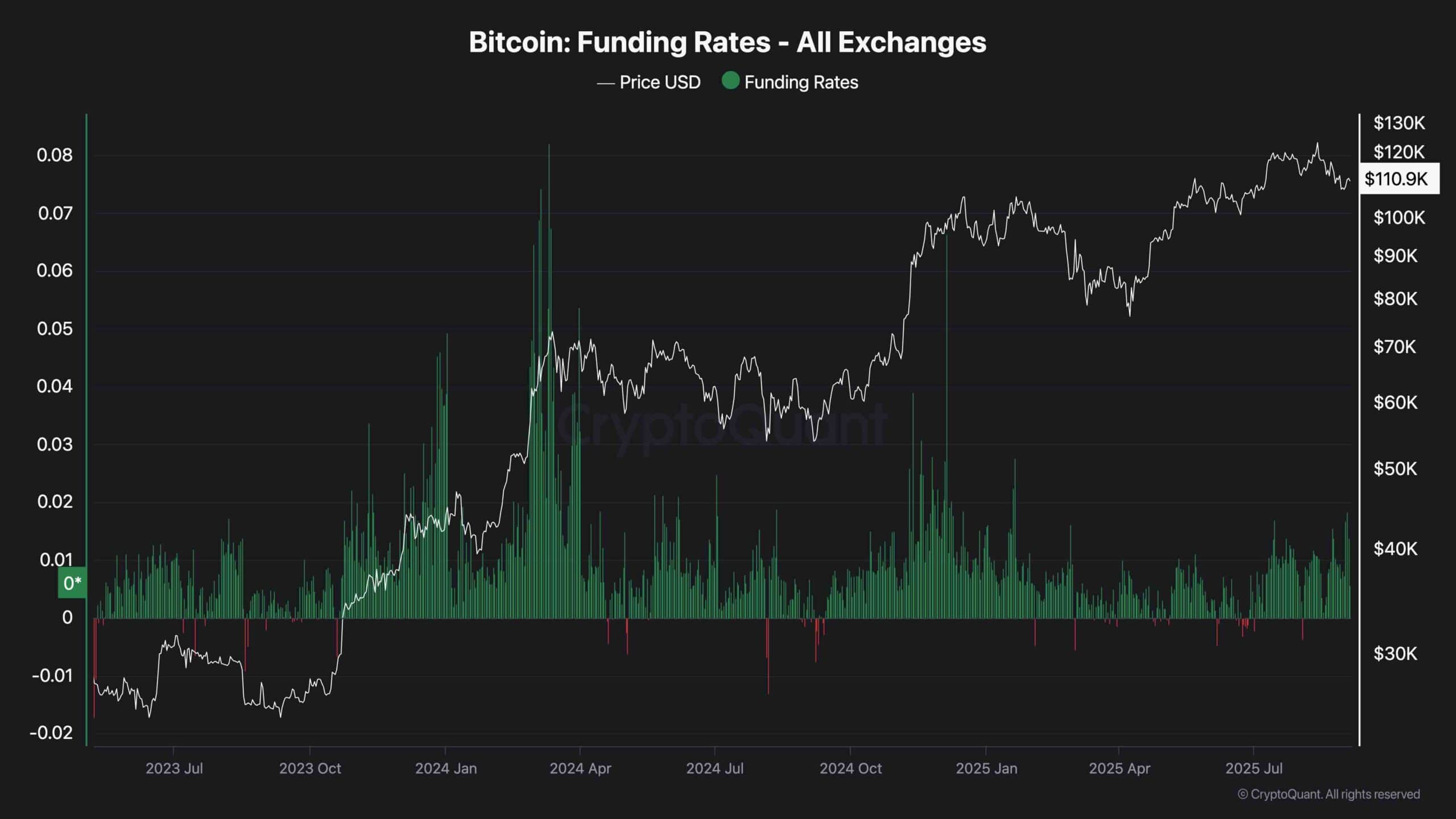 Interestingly, despite Bitcoin’s strong run earlier this year, funding rates have calmed significantly compared to the spikes seen in early 2024 and 2025. This indicates that speculative momentum has cooled, and accumulation may be underway rather than aggressive chasing. If funding rates remain moderate, it could provide a healthier foundation for the next impulsive move.