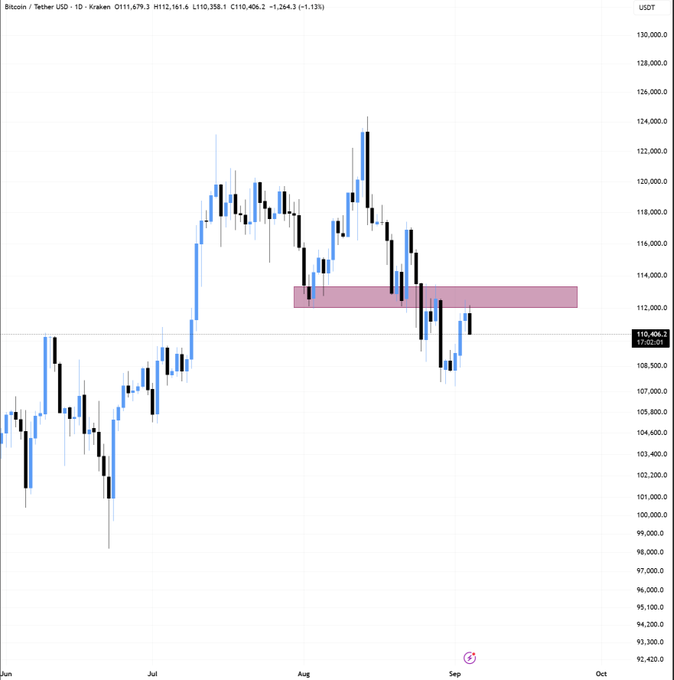 An outlook shared by pseudonymous cryptocurrency analyst BitBull in an X post on September 4 indicated that Bitcoin was rejected from the $114,000 resistance zone on the daily chart, a level that has now turned into a strong supply area.