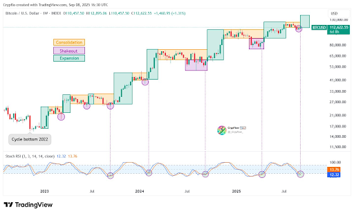 The chart below, which was shared by the analyst, shows this repeating pattern of shakeouts in purple circles and expansions in green boxes since the cycle bottom in 2022, with the latest dip in the last week of August slotting neatly into the same framework of a purple shakeout.