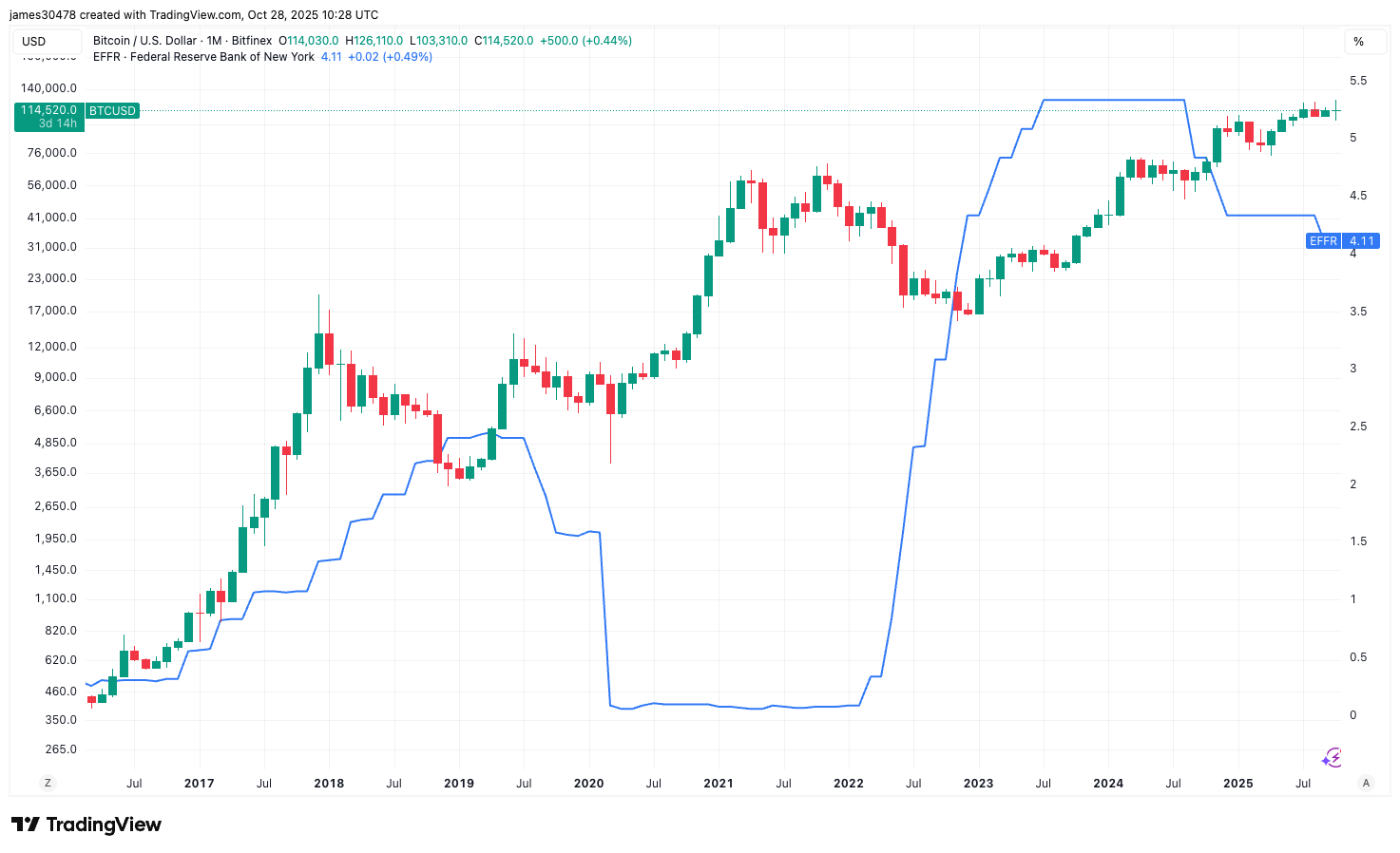 Unlike previous peaks in 2017 and 2021, which coincided with Federal Reserve rate hikes, this cycle is unfolding amid a cutting cycle. The Fed has already reduced rates by more than 100 basis points since September 2024, with another 25-basis-point cut expected on Wednesday and rates projected near 3.25–3.50% by Q1 2026—conditions that could give risk assets further room to run. The Fed is also ending quantitative tightening, the process of shrinking its balance sheet and draining liquidity, signaling a shift toward easier policy.