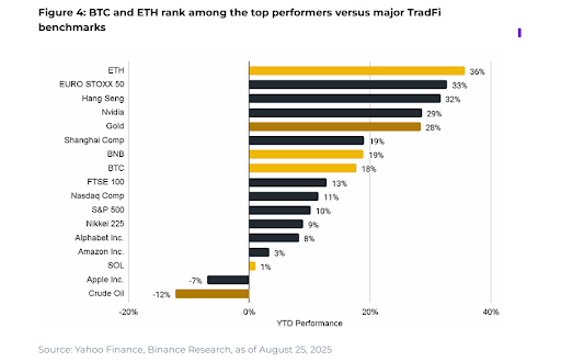 In Binance Research’s August 2025 edition of 10 Charts Shaping 2025, one of the key topics discussed was the outsized performance of cryptocurrencies, including Bitcoin, relative to traditional asset benchmarks: