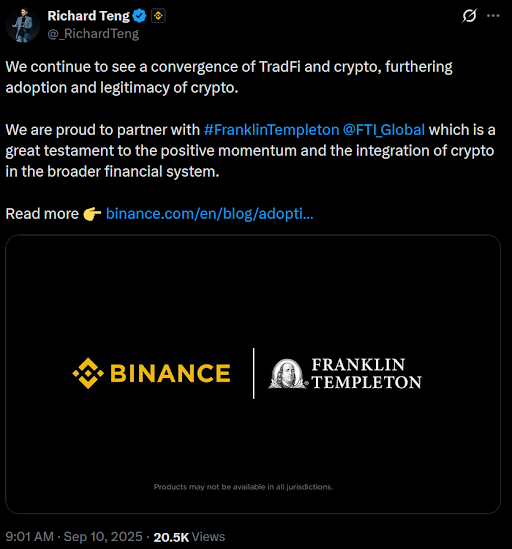 Institutional interest continues to increase even with the recent crypto pull-back. One example of this is the recent partnership between crypto exchange leader Binance and global investment leader Franklin Templeton. Binance CEO Richard Teng commented on the partnership in a recent X post, “We continue to see a convergence of TradFi and crypto, furthering adoption and legitimacy of crypto. We are proud to partner with #FranklinTempleton @FTI_Global which is a great testament to the positive momentum and the integration of crypto in the broader financial system.”